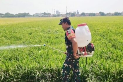 Babinsa Dampingi Poktan Sirandu Jaya Lakukan Penyemprotan Hama Padi Dukung Ketahanan Pangan Nasional
