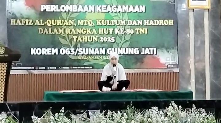 Cirebon, 26 September 2025 – Dalam rangka memperingati Hari Ulang Tahun (HUT) ke-80 Tentara Nasional Indonesia (TNI), Komando Resor Militer (Korem) 063/Sunan Gunung Jati (SGJ) menggelar Lomba Hafiz Al-Qur’an yang diikuti oleh peserta dari berbagai wilayah di Jawa Barat. Salah satu peserta yang menarik perhatian publik adalah F. Alyssa Quinn, siswi kelas VI A SDN Sadagori 1 Kota Cirebon sekaligus santri TPQ Hodayatussibyan, Pondok Pesantren Al-Amin, Ciperna.