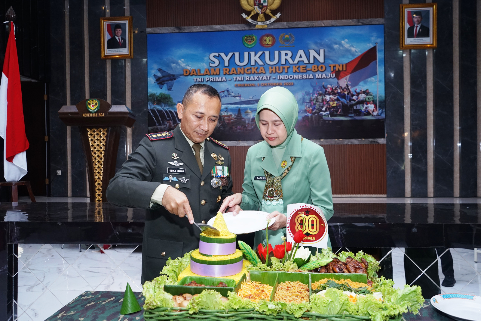 Usai pelaksanaan upacara, kegiatan dilanjutkan dengan acara syukuran dan ramah tamah di Aula Sunan Gunung Jati Makorem 063/SGJ. Dalam suasana penuh keakraban, bersyukur atas usia ke-80 TNI yang terus menunjukkan eksistensi dan pengabdiannya kepada bangsa.
