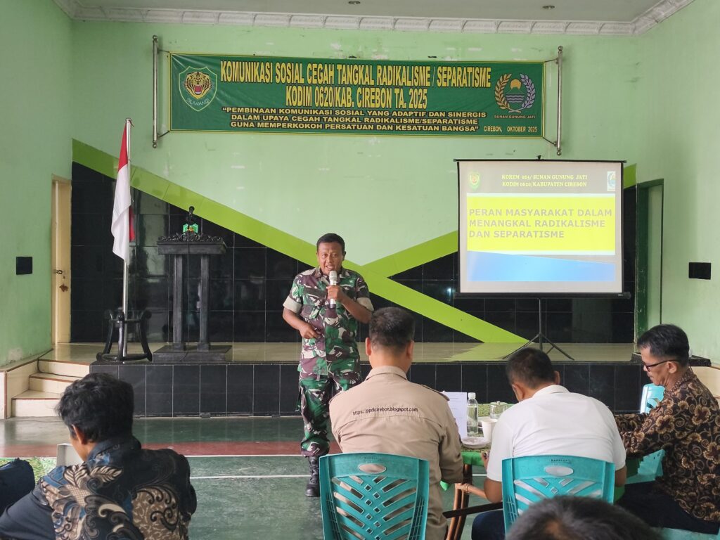 Cirebon, 24 Oktober 2025 — Komando Distrik Militer (Kodim) 0620/Kabupaten Cirebon menggelar kegiatan Komunikasi Sosial (Komsos) Cegah Tangkal Radikalisme/Separatisme Tahun 2025 bertempat di Aula GSG Kodim 0620/Kabupaten Cirebon.