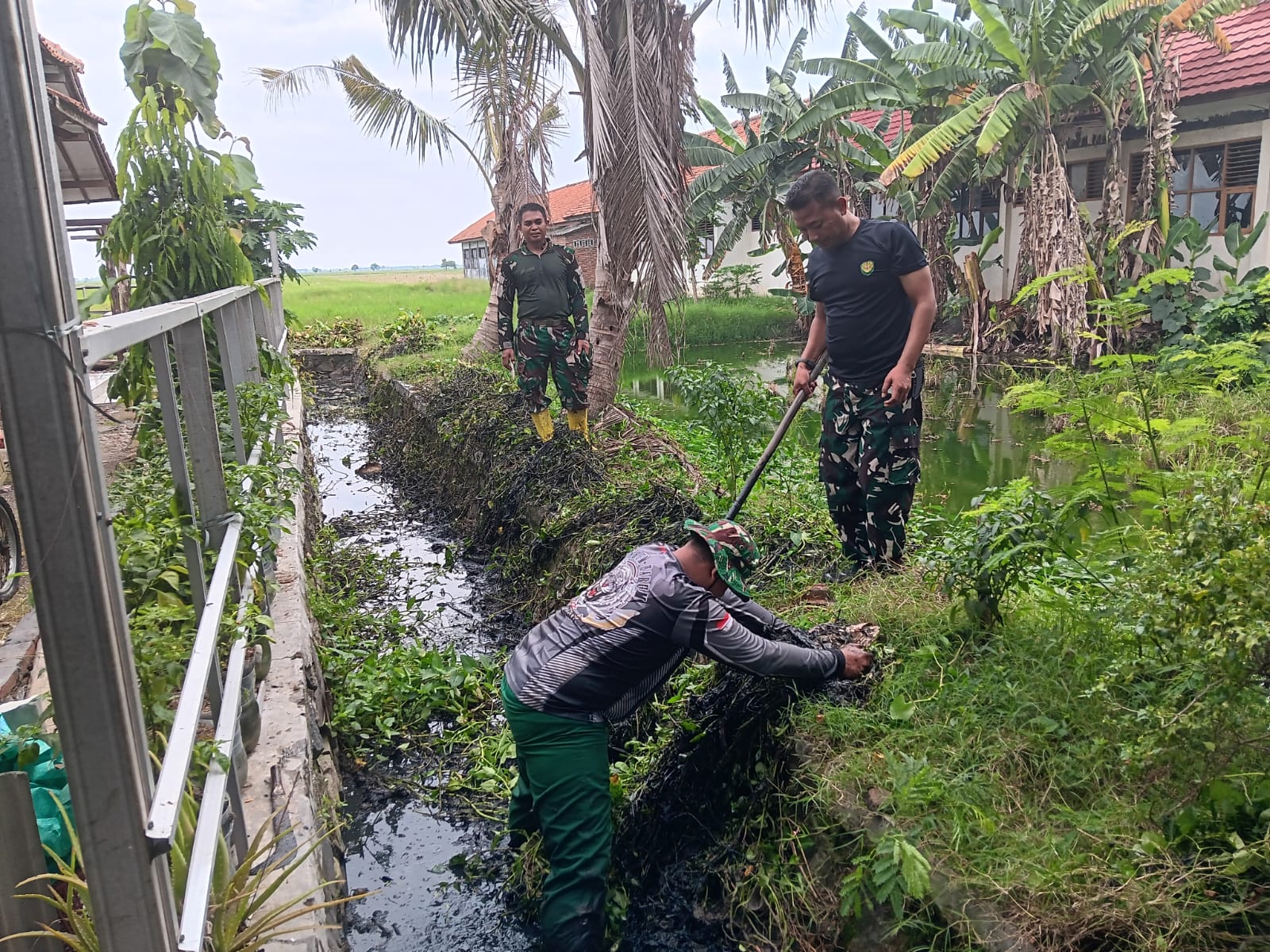 - Koramil 0620-14/Weru melaksanakan pembersihan saluran air di Blok Kebon Gede RT 07/02, Desa Gamel, Kecamatan Plered. Sasaran kegiatan ini adalah mengangkat sampah dan endapan lumpur yang menyumbat drainase guna memperlancar aliran air dan mencegah genangan saat hujan turun.